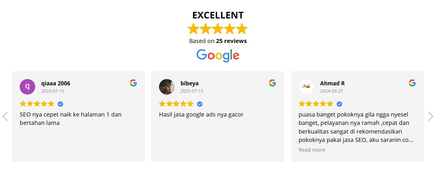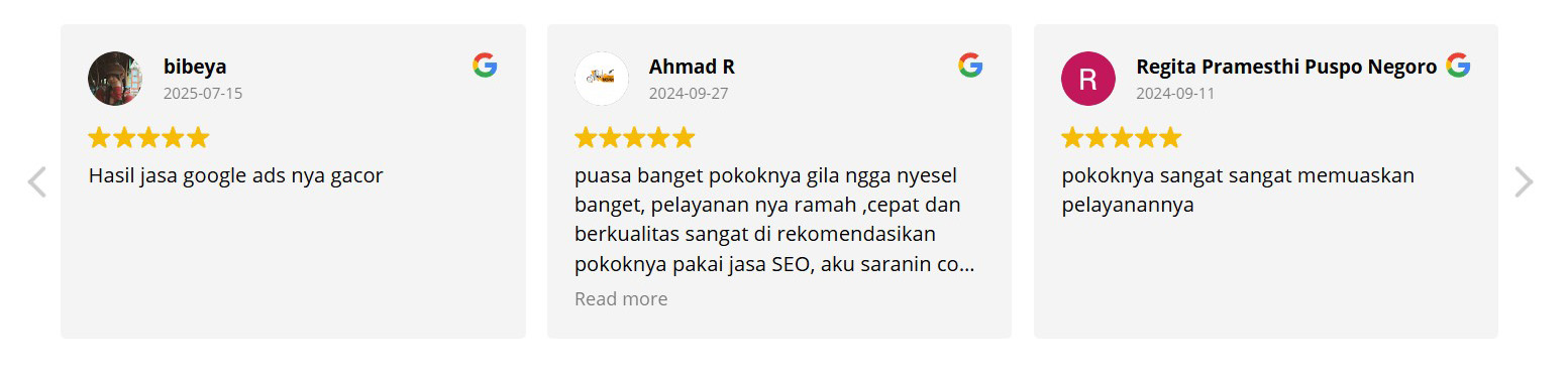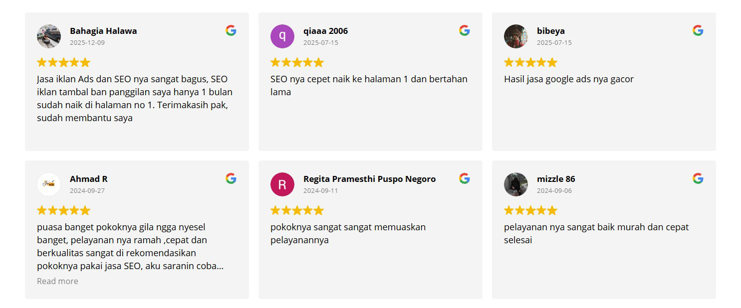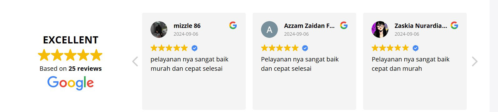 Untuk Di Ketahui Bahwa Kami Tidak Memberikan Layanan Untuk Menambah / Menaikkan Review Dari Google My Business Anda. Akan Tetapi Mengkoneksikan / Menarik Data Ulasan Dari Akun Google My Business Anda Ke Website Anda. Contoh nyata seperti pada testimoni dibawah ini.